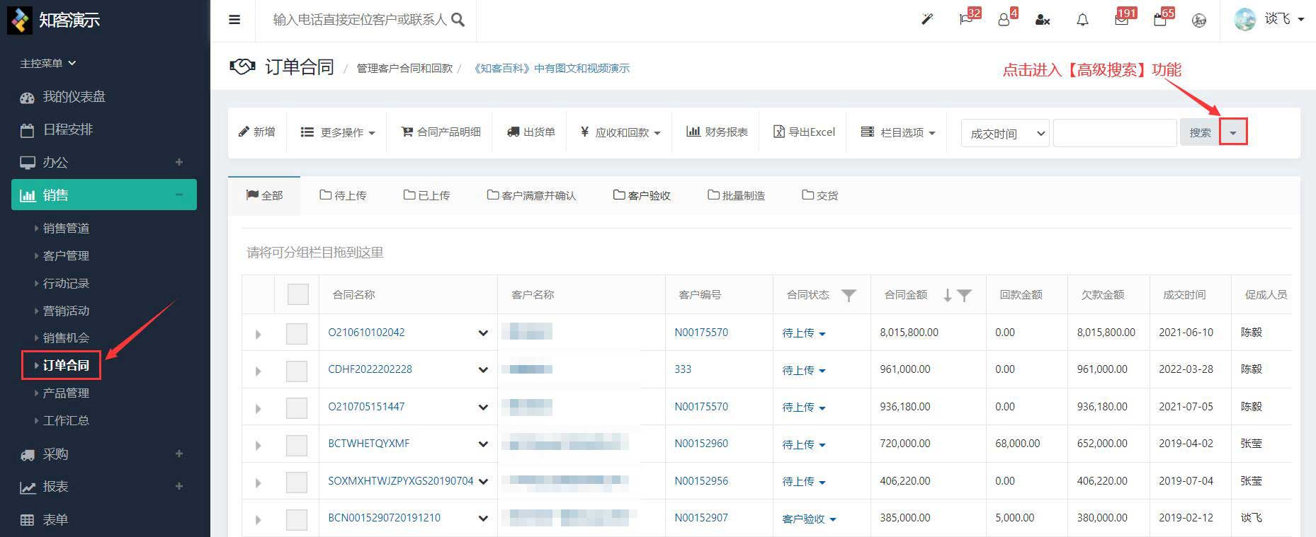 1、我们登录知客CRM,进入【销售 - 订单合同】模块,我们可以点击进入【高级搜索】功能。