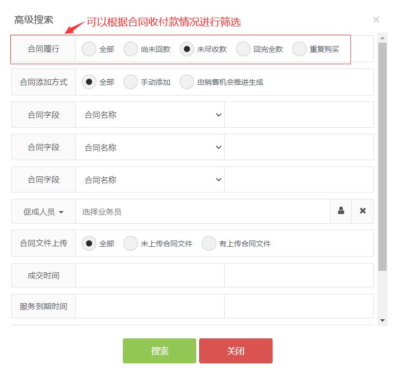2、在【高级搜索】界面里,我们可以根据合同的收付款详情(如尚未回款、未尽收款、全款已回等)进行未收齐款项的订单合同的筛选。