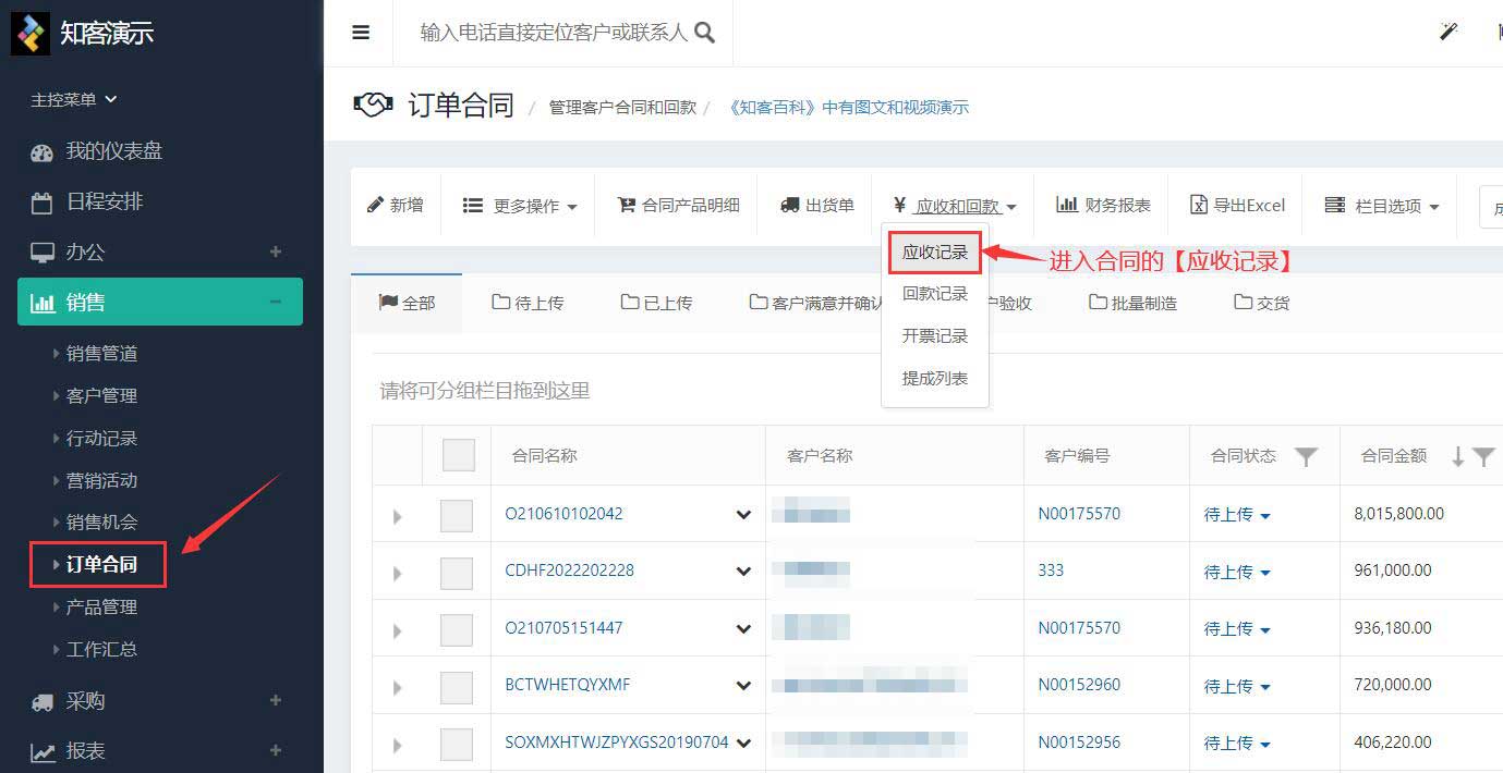 3、而除了通过合同支付款情况进行筛选,我们还可以通过合同的应收款列表来汇总未收齐款项的合同。我们在客户管理模块中,进入【应收和回款 - 应收记录】。