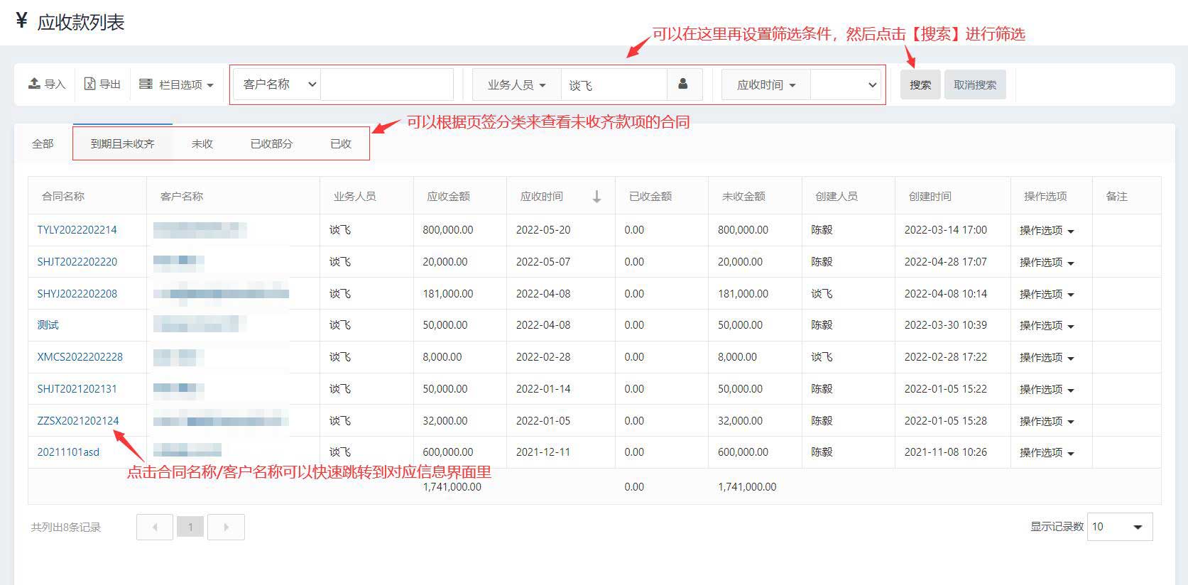 4、在合同的应收款列表里,CRM系统会自动根据回款情况(到期且未收齐、未收、已收部分等)将合同分类,我们点击对应页签就可以查看里面记录的合同详情了。也可以设置好筛选条件(客户名称、业务人员、收款时间等),找到更具体的应收款记录。