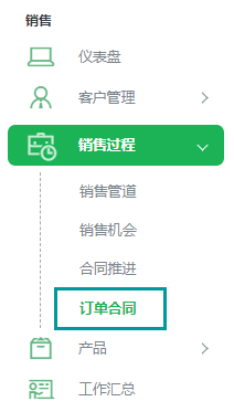 1、我们通过知客CRM的左侧菜单栏,进入【销售】-【销售过程】-【订单合同】的页面里。