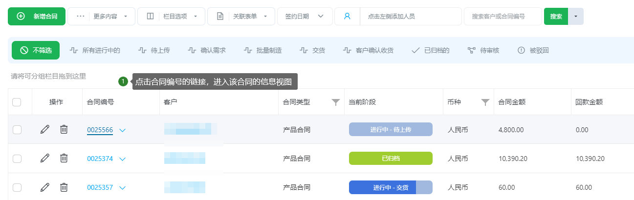 2、订单合同列表会显示当前账号有权限查看的大多数订单合同。我们在列表上找到要管理开票记录的合同,点击合同编号的蓝色链接进入该合同的信息视图中。