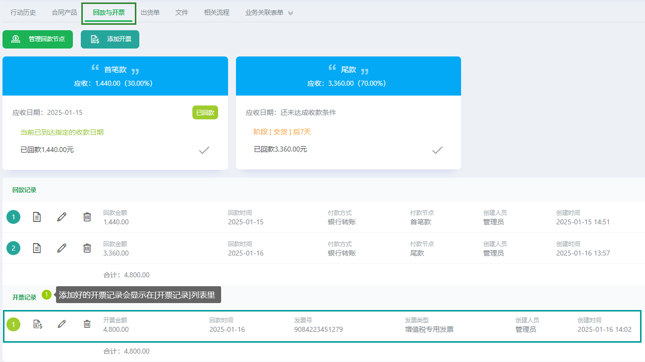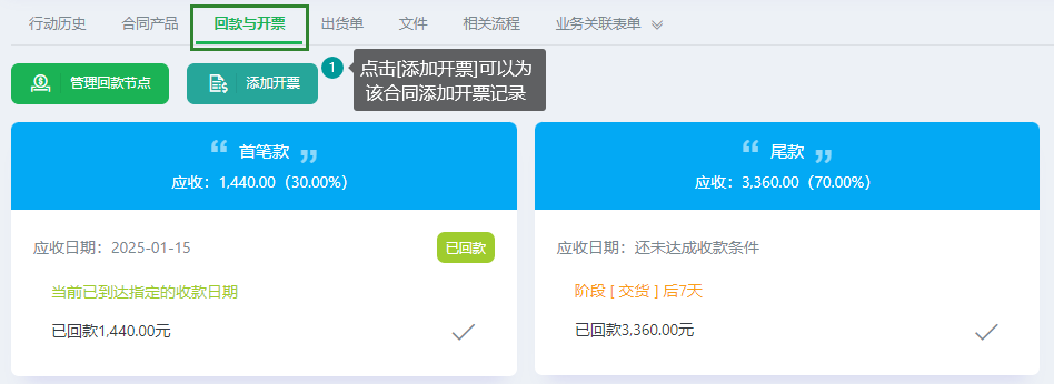 3、我们接着进入合同信息视图的【回款与开票】页面里。在这里我们可以通过点击【添加开票】来为该合同添加开票记录。