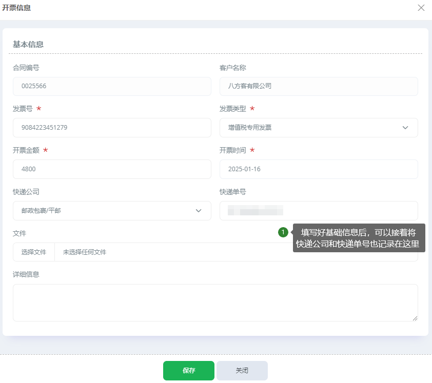 4、在添加开票记录的界面中,我们填写好发票号、发票类型、开票金额等基础信息后,可以接着将快递公司和快递单号也记录在这里。添加好的开票记录会显示在合同信息视图的【回款与开票】页面的【开票记录】列表里。