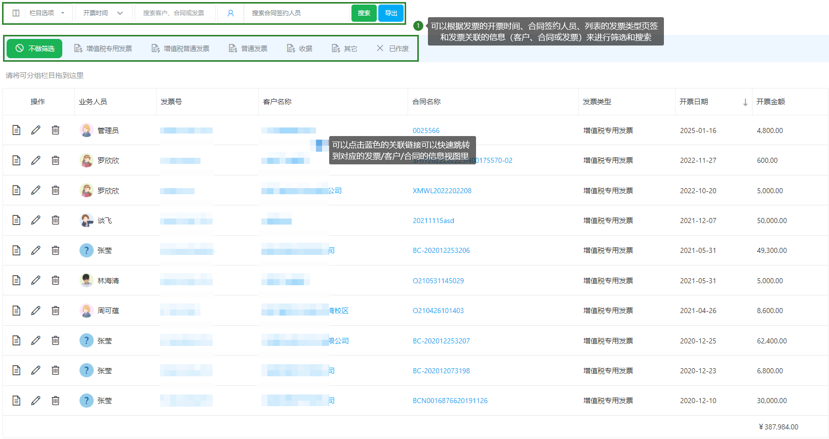 在搜索到开票记录信息后,我们可以在发票列表上了解发票记录的各项信息,也可以点击蓝色的关联链接来快速跳转到对应的发票/客户/合同的信息视图里去。